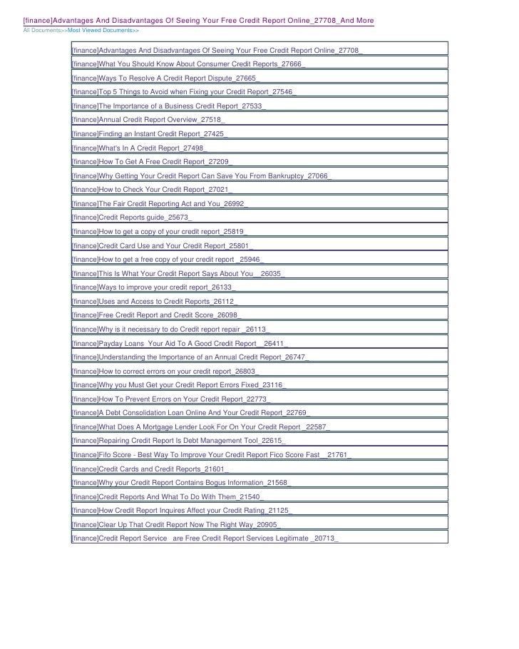There look to be as lots of drawbacks as positive aspects to seeing your free credit report on the internet. The down sides of seeing your free credit report on line contain the fact that you will need to shell out a enterprise if you want to view your credit score report on the internet. So you are in impact having to pay to view some thing that is yours, which constantly does not appear honest. Other drawbacks of seeing your free credit report on the internet include things like the basic fact that you obtain an yearly credit score report anyway. The yearly report is cost-free, also, so why bother filling out kinds and surveys and offering out delicate details to get a "absolutely free" credit score report that fundamentally offers you the similar specifics as your yearly one?